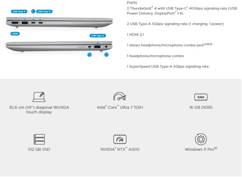 HP ZBook FireFly G11 14′ WUXGA Touch Intel AI U7-155H 16GB DDR5 512GB SSD WIN 11 PRO RTX A500 Thunderbolt Fingerprint 3yrs OS 1.4kg Mobile Workstation