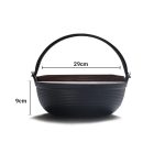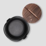 - Crafted of cast iron with handle and a wooden lid