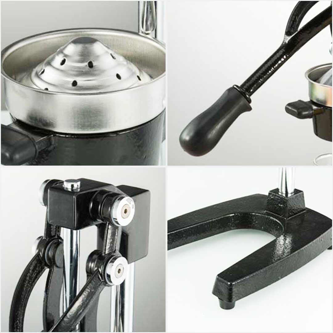 - The main body is made of a sturdy cast iron construction base with a food-grade 304 stainless steel strainer and a large opening for juice collecting.