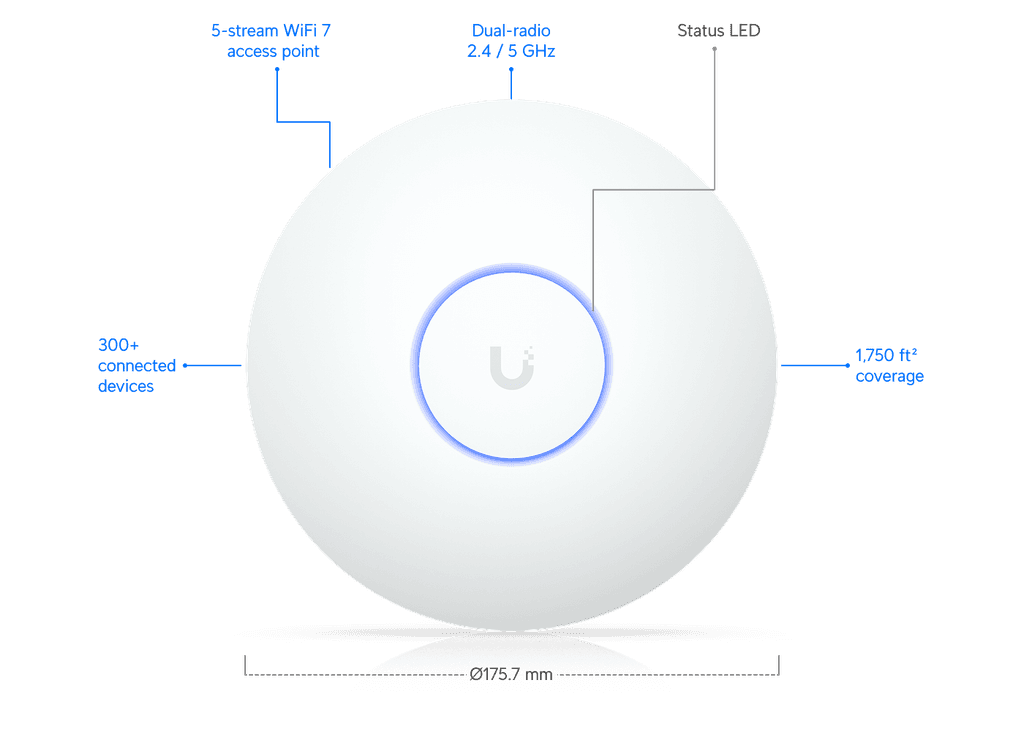 Compact, ceiling-mount WiFi 7 AP with 5 spatial streams and extended signal range.